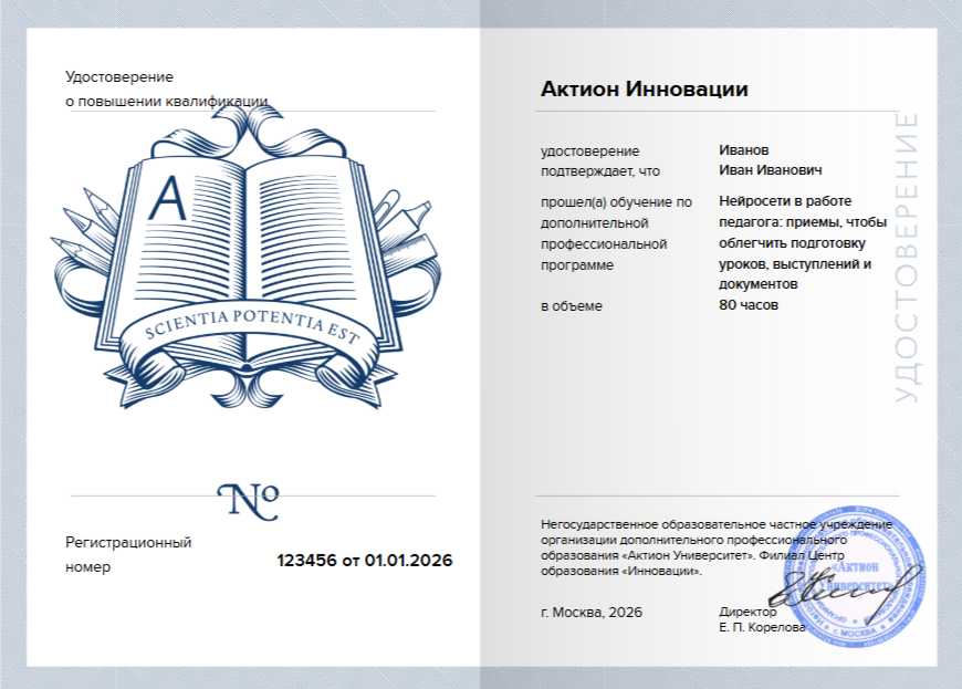 После успешного окончания курса «Нейросети в работе педагога: приемы, чтобы облегчить подготовку уроков, выступлений и документов» вы получаете диплом установленного законом образца